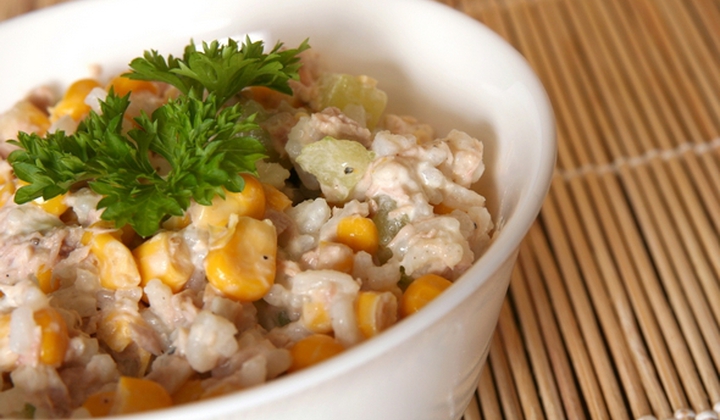 მოვხარშოთ ბრინჯი და გადავიტანოთ თასში. დავამატოთ სიმინდის კონსერვი. თევზს გადავუღვაროთ წვენი, დავძიძგნოთ და დავამატოთ სალათს.