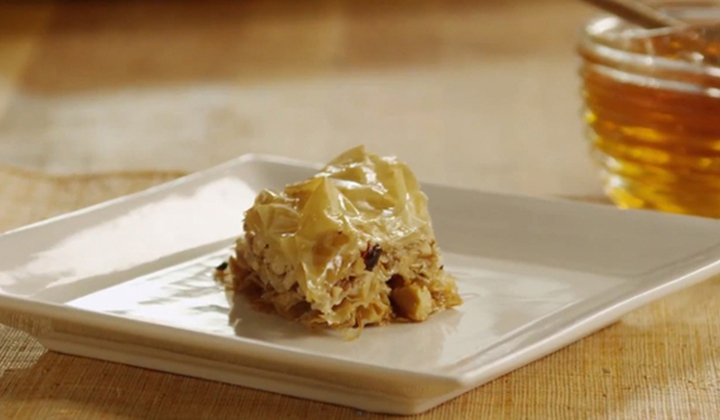 ცომის ბოლო ფენად გამოიყენეთ ფილოს 6 ფურცელი და მასცეზ მოაცხეთ კარაქი ზევიდან. მჭრელი დანის გამოყენებით გააკეთეთ 3 ჰორიზონტალური და 9 დიაგონალური ზოლი 36 ცალი რომბისებრი ნაჭრის მისაღებად. შედგით დაჭრილი ბაქლავა გახურებულ ღუმელში და აცხვეთ 50 წუთი, ან სანამ არ გახდება ოქროსფერი და ხრაშუნა.