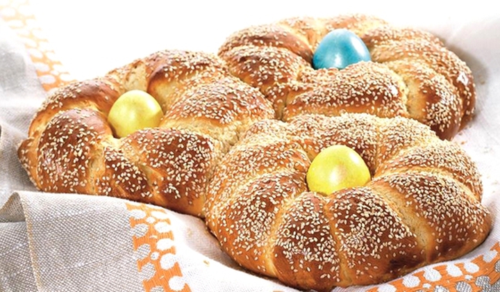 როდესაც ცომი მოცულობაში გაორმაგდება, ჩაზილეთ და ისევ დატოვეთ გასაფუებლად. შემდეგ გადაზილეთ ცომი და გაყავით 6 ნაწილად. გააბრტყელეთ თითოეული განიერ ზოლად და ორ-ორი ზოლისგან დაწანით სამი ნაწნავი. ყოველი ნაწნავი დაახვიეთ წრიულად და მოათავსეთ საცხობ ლანგარზე (ლანგარზე წინასწარ ცხიმწასმული პერგამენტის ქაღალდი დააფინეთ). სამივე ნაწნავი მოათავსეთ ისე, რომ მათი ბოლოები ცენტრში ერთდებოდეს. ღუმელში შედგმამდე დააფარეთ ჭურჭლის ტილო და გააჩერეთ 30-40 წუთით.