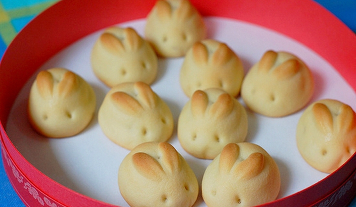 ცომის მასა დაყავით 16 თანაბარ ნაწილად და თითოეულს კვერცხის ფორმა მიეცით. საცხობი ლანგარი დაფარეთ საცხობი ქაღალდით და განათავსეთ მასზე ყველა ბაჭია. მაკრატელის გამოყენებით ვიწრო მხარეს გაუკეთეთ ყურები და ორი პატარა ჩაღრმავება თვალებად.